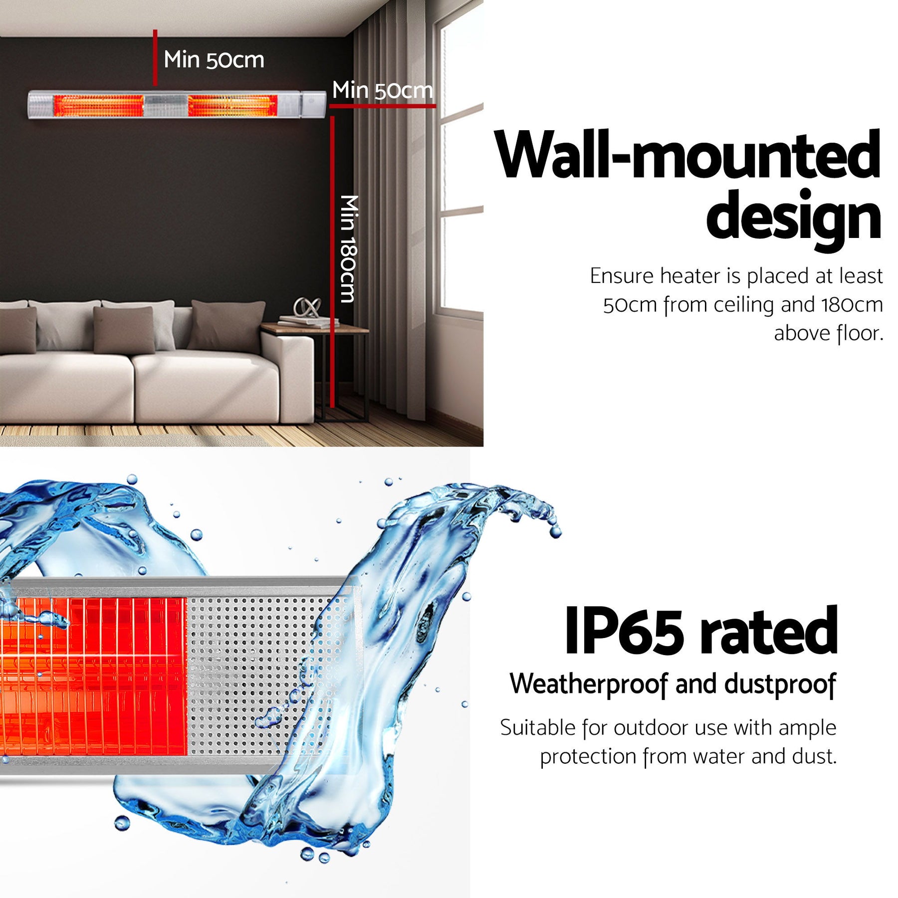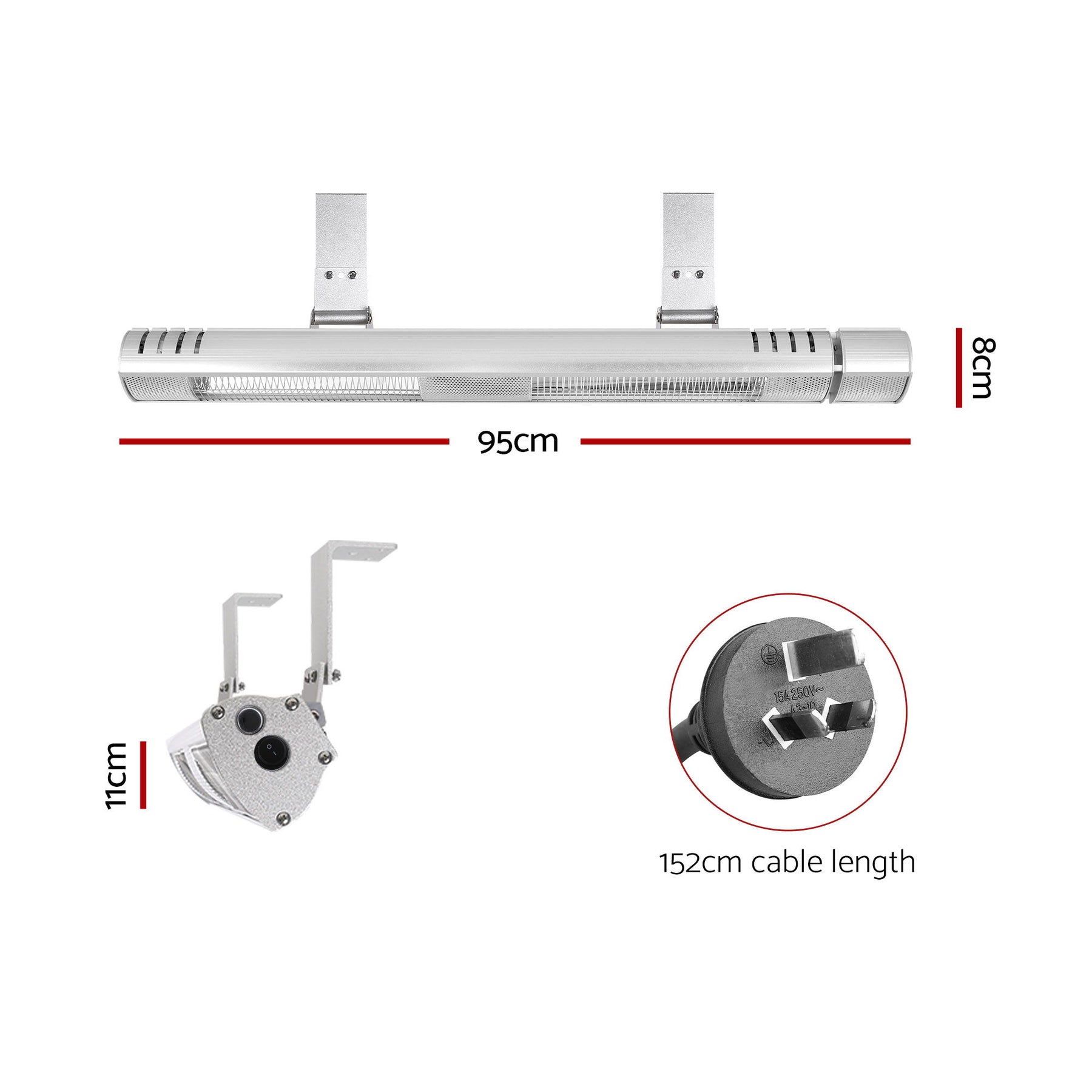 Regular price $216.99Just as the sun heats the Earth, a Devanti Halogen Heater will heat your home this winter, providing soothing sun-like warmth with its aluminium reflective heating technology. As infrared heating heats objects and not the air around them, this eco-friendly heater is more energy-efficient and cost-effective than other heaters. It features an unobtrusive design that will suit anywhere and adjustable swivel brackets to find the perfect heating position. Get warm from anywhere using the included remote control. The heater doesn?? emit any odours, fumes or carbon dioxide, and up to 95% of the energy generated is converted into useful heat for your home. It has an IP65 rating that makes it perfect for outdoor and indoor use, and the halogen heater can be wall or ceiling mounted to suit your space requirements. With no moving parts, the heater also works silently and is virtually maintenance-free. Stay warm and cosy this winter with a Devanti Halogen Heater.