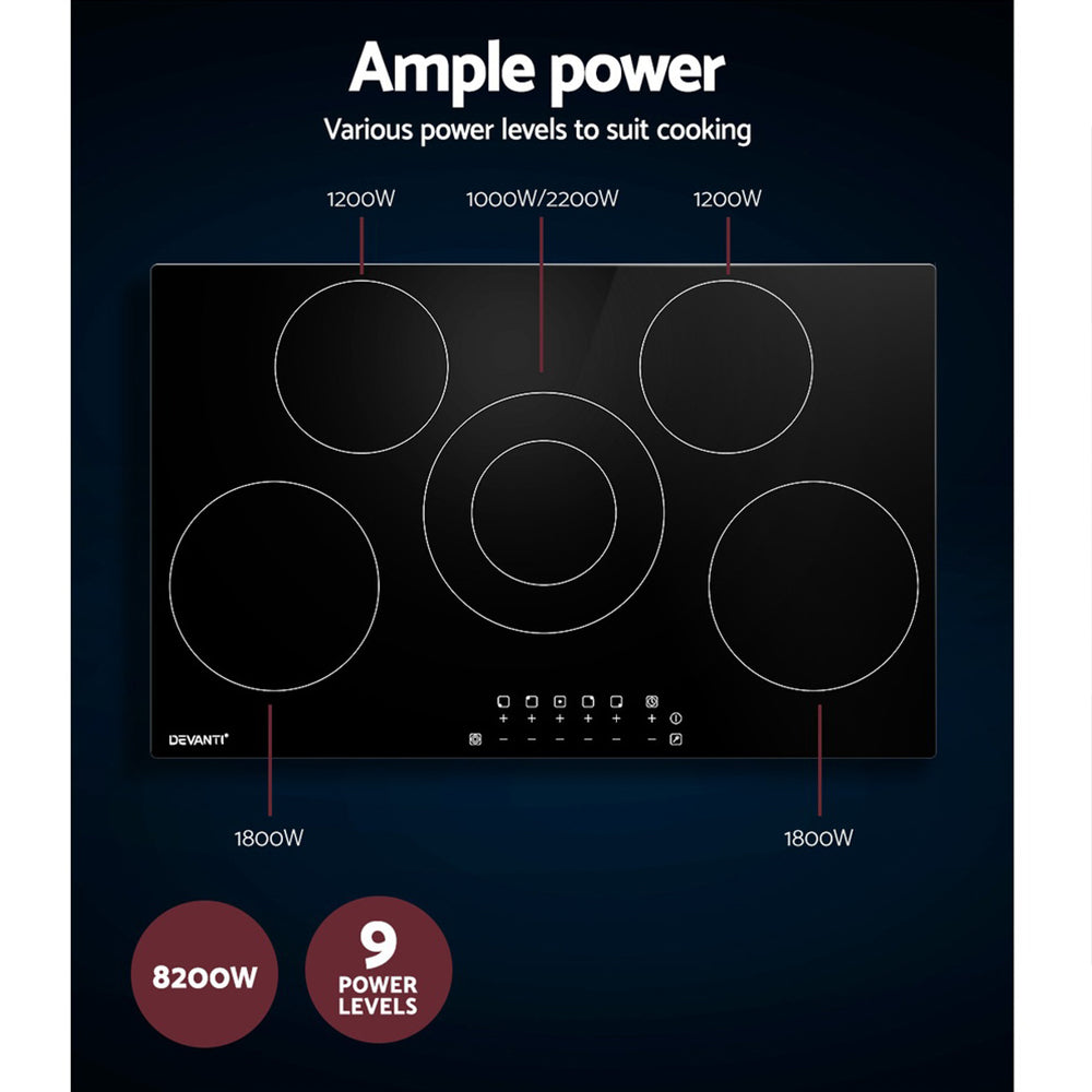 Regular price $552.99 Sale price $532.99Whether it is for your existing or new home, our Devanti 90cm Ceramic Cooktop is just the thing you need for easy, no-fuss cooking. Loaded with an extensive list of chef-friendly features such as high wattage cooking zones, touch control and LED display panel, independent 99-min timers, overheat protection and efficient heat dissipation, this cooktop is also incredibly sleek with its high-grade black ceramic glass plate. It features six cooking zones (or five including one dual-ring) with nine power levels to choose from to prepare that perfect dish. Plus, the residual heat indicator also helps to tell when it is safe to touch the cooktop after turning the hot plates off. Better still, the cooktop will turn itself off when temperatures get excessively high or you simply forget to turn it off after your cooking. Powerful and yet integrally safe, the cooktop promises many moments of hassle-free delicious cooking with the right blend of sophistication and class for your kitchen.