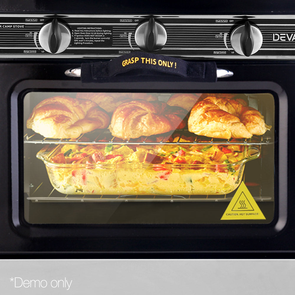 The unit has all the thoughtful and safety features that you??l come to expect from a quality product. Insulated cloth sleeve design, push-in piezo burner ignition, flame-out protection, built-in oven heat gauge, non-stick enamel cooking surface, a three-sided windscreen provided by the folding lid and side arms, fully-adjustable heat-control dials and many more great features. With its corrosion-proof and longlasting stainless steel construction, the Devanti Portable Gas Stove and Oven opens a host of cooking possibilities anywhere and anytime.